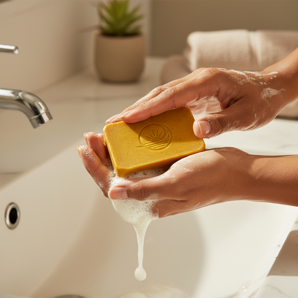 Rub the Terraura Radiance Bar between your hands to create a creamy foam. Apply gently to the affected areas (face or body), massaging in circular motions for 1–2 minutes.
